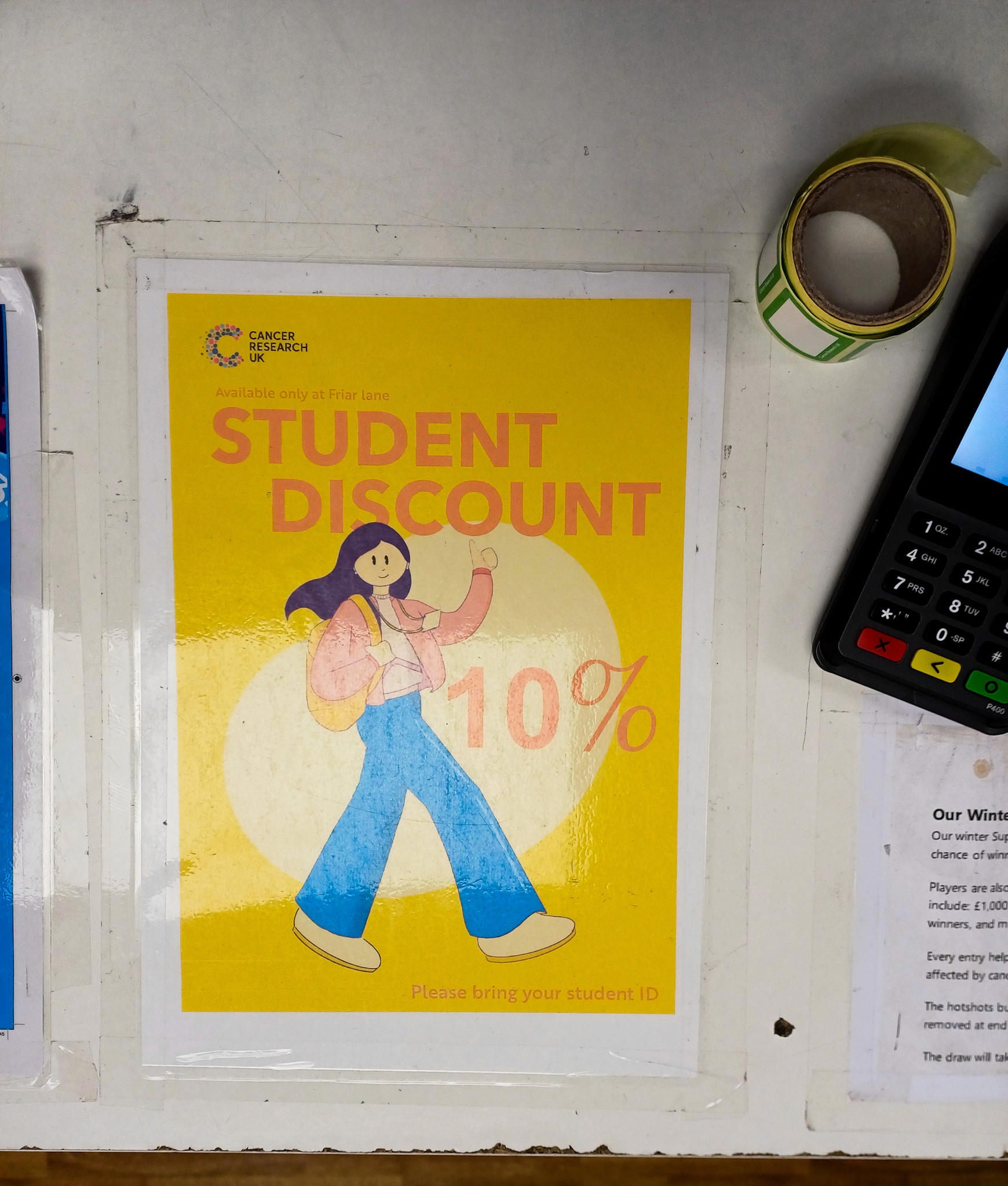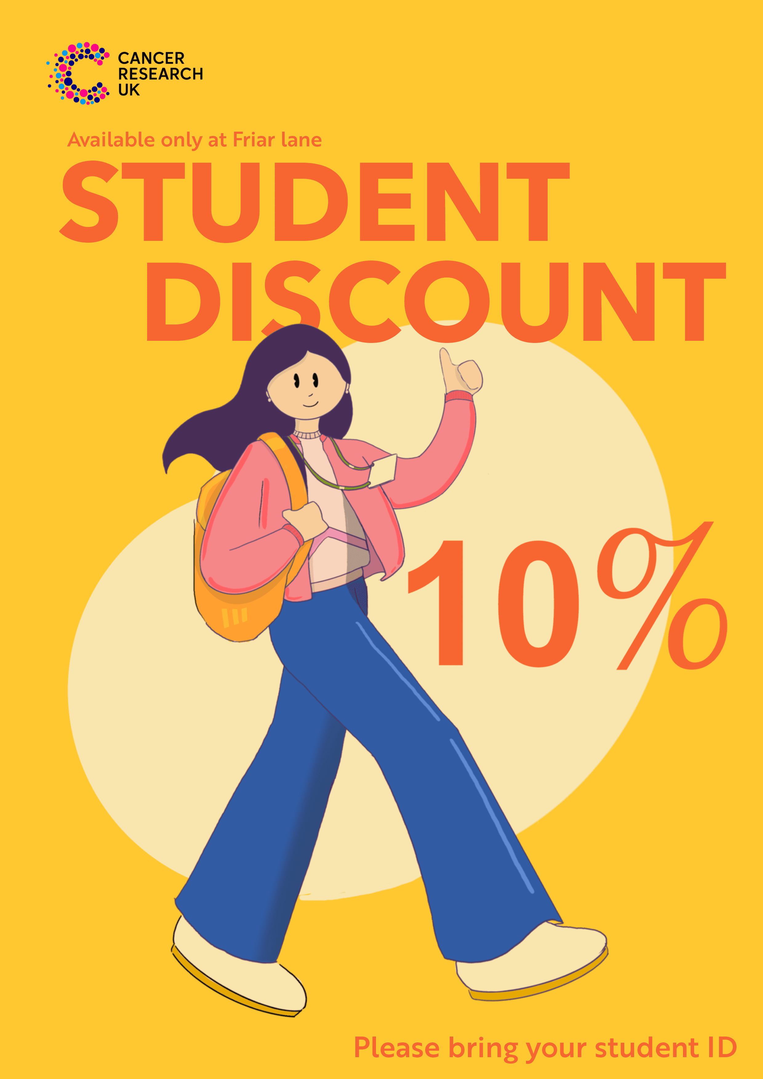 I volunteered here on weekends and was tasked by my supervisor with designing a student discount poster to be displayed throughout the store. To attract attention, I used a vibrant colour palette to draw in passersby. I also applied visual hierarchy to emphasize key text, ensuring the message was clear and easy to read at a glance. To connect with the target audience students I created a relatable, exaggerated character that added a fun and engaging element to the design.