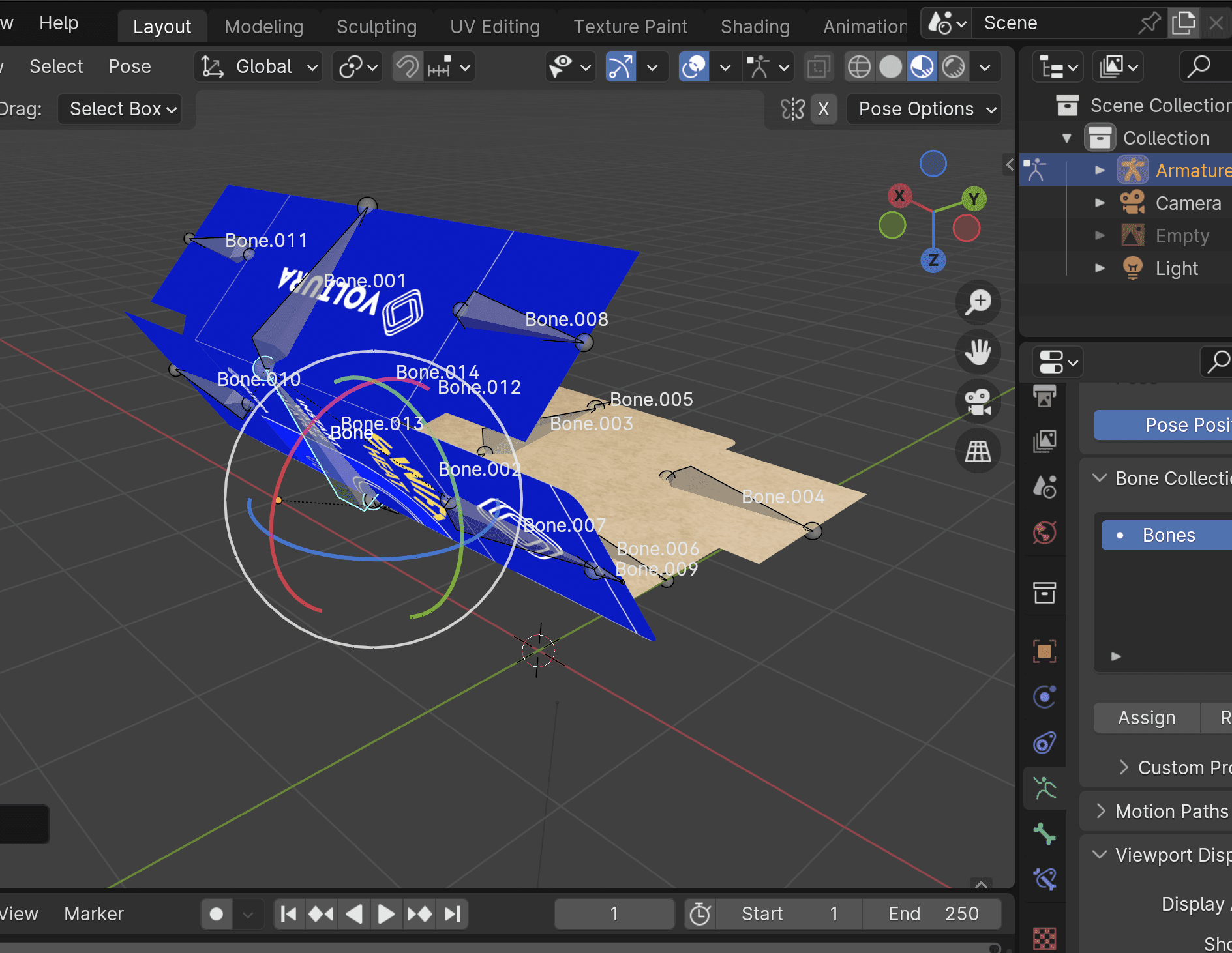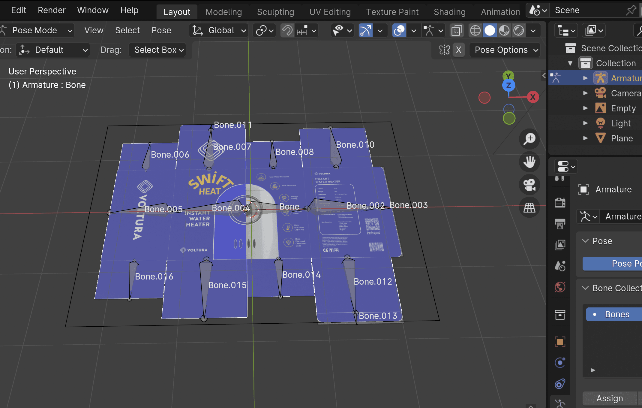 For the opening video, I started by recreating the die cut of the packaging in Blender. I then rigged it using spines, which allowed me to bend the packaging into various positions. This was my first time animating in blender, and it was a challenging process. I relied heavily on YouTube tutorials to help me navigate the complex process but it was worth it at the end.