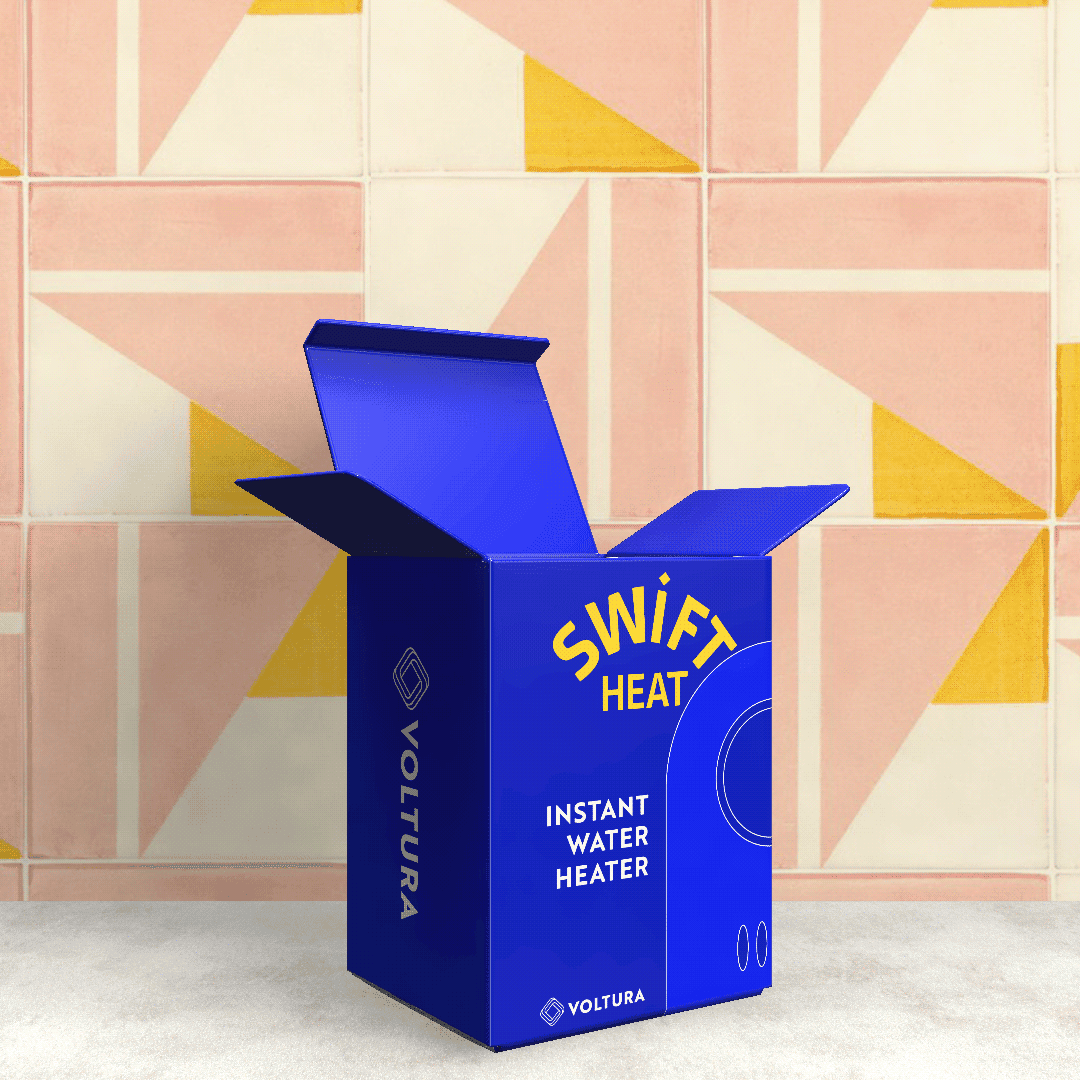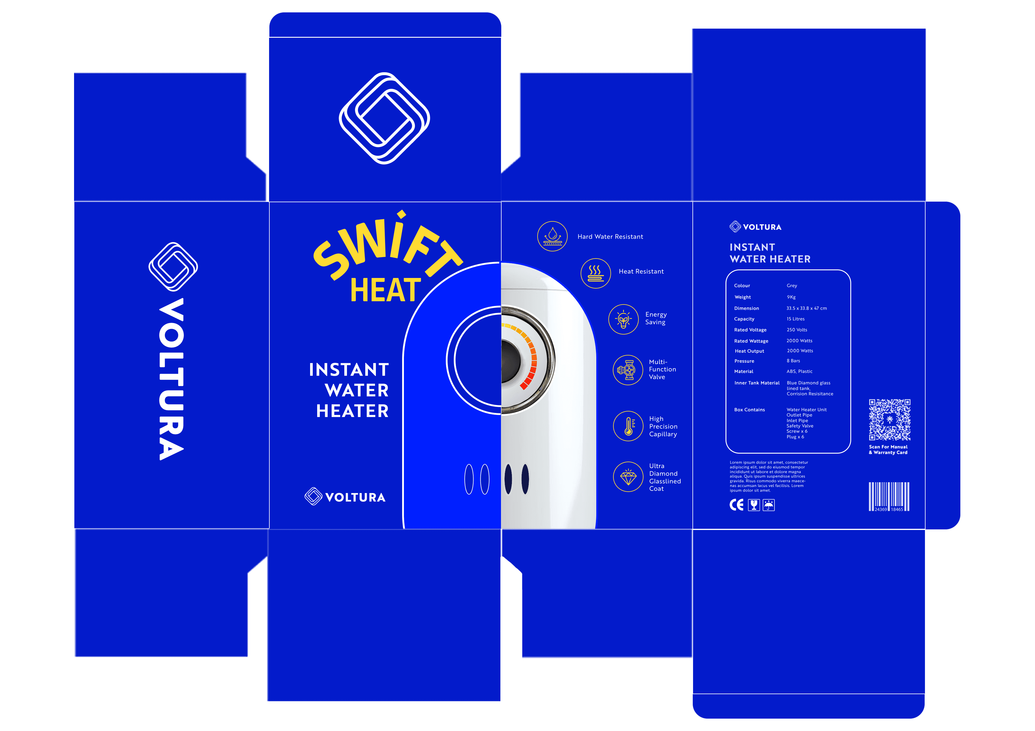 The logo is designed to symbolize the interconnectedness of wires, which is one of Voltura's core products and best-selling commodities. The design reflects the essence of the brand, highlighting the importance of connectivity, reliability, and innovation—key attributes of their vision statement. The market was saturated with red being the primary colour in most of their competitors' brands. Previously, they themselves had red branding, probably to fit in the market. But with blue now being their primary color, it not only makes them stand out from the rest of their competition. The addition of interchangeable white adds versatility across their packaging range.